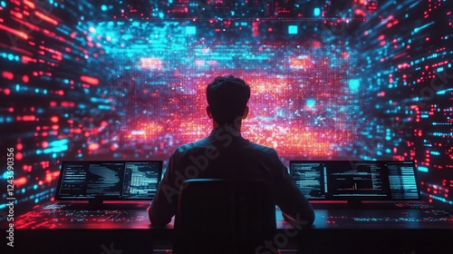 Man sitting in a dark room working on a laptop with focused expression and dim lighting