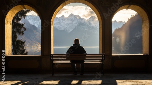 Man sitting on bench overlooking alpine lake