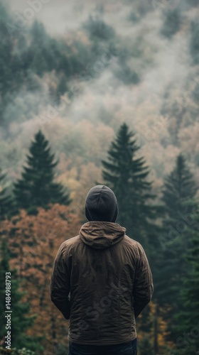 Man standing in a misty forest, feeling peaceful and alone.
