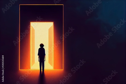 man standing in front of the glowing door that lead to another realm, digital art style, illustration painting