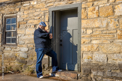Man standing lighting a pipe infront of an old rock building entrance
