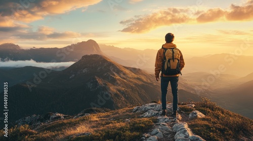 Man standing on a mountain peak overlooking a valley with a beautiful sunset.