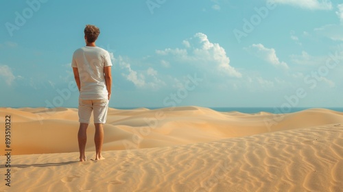 Man standing on desert dunes under a clear sky