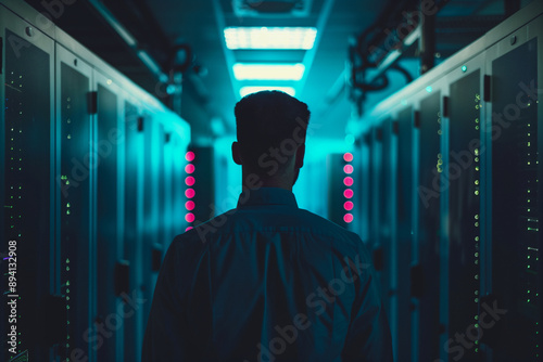 man stands in a room with many computer servers. The room is dimly lit and the servers are glowing. The man is looking at the servers, possibly checking on their status or working on a project