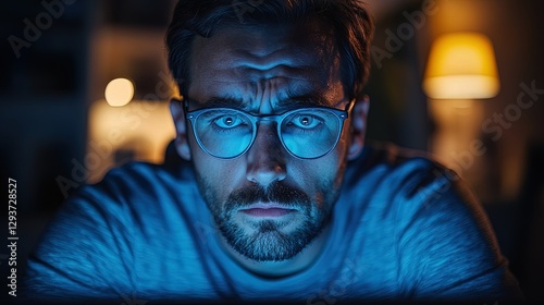 Man staring blankly at a computer screen in a dark room, with stressed and exhausted expression