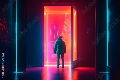 Man Steps into Door Entrance to the Future. Moving Forward to Metaverse, New Technology, Web3.0, Blockchain and the Next Layer of the Internet. Futuristic Illustration. Generative Ai.
