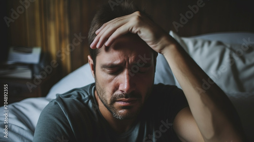 man suffering from headache desperate and stressed because pain and migraine. Hands on head.