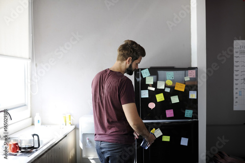 Man Taking Water Bottle From Fridge in Pantry Room During Break Time