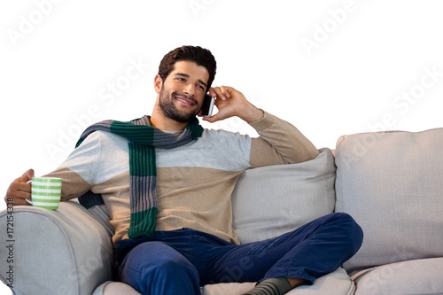 Man talking on mobile phone while having coffee against white
