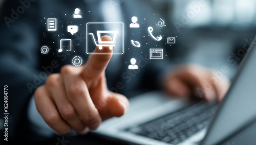 Man taps shopping cart icon on interface. Illustrates e-commerce, digital shopping, and online services. Use for marketing, web design, advertising.