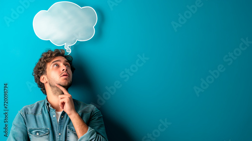Man thinking with speech bubble, concept idea on blue. studio background with copy space.