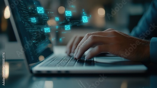 Man Typing Email on Laptop at Night