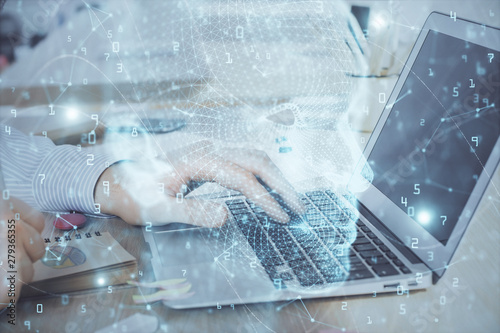 Man typing on keyboard background with brain hologram. Concept of big Data. Double exposure.