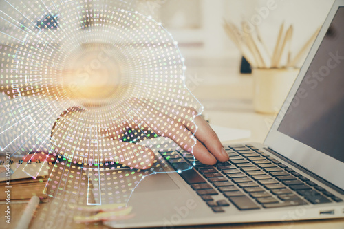 Man typing on keyboard background with brain hologram. Concept of big Data. Double exposure.