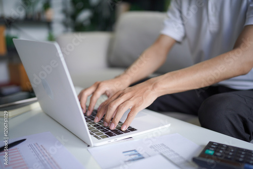 Man typing on laptop by two hands, He sitting on sofa in living room at home
