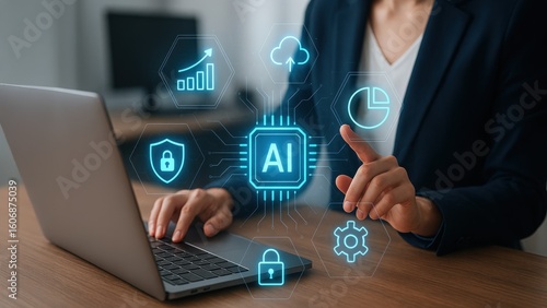 Man typing on laptop in office with floating blue AI icons, showing digital tools, cloud tech, and AI Results with Search Interface