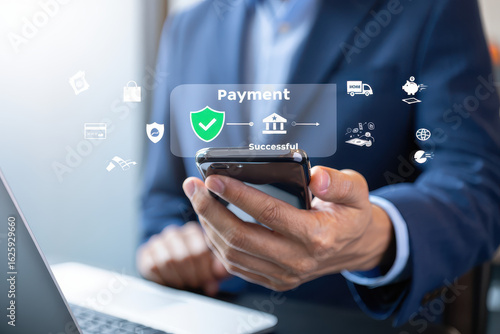 Man using a smartphone for online payment with a successful transaction and security icons displayed
