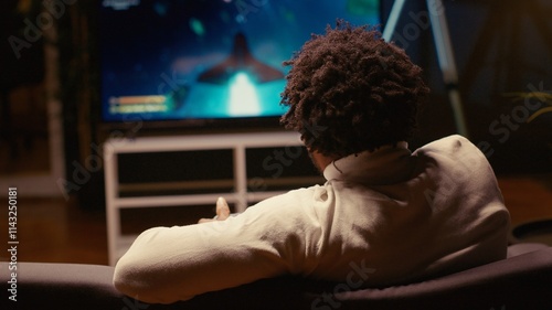 Man using cloud gaming service to play demanding science fiction videogame on large TV display. Gamer enjoying high quality graphics, streaming game online, handheld camera shot