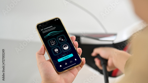 Man using EV application on his phone to check charging status while plugged in the EV charging connector