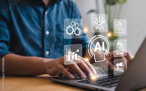 Man Using Laptop with AI Interface and Business Icons Exploring the Future of Technology and Artificial Intelligence