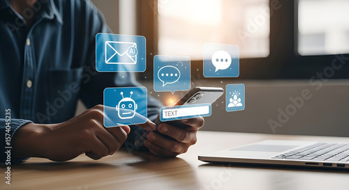 Man Using Smartphone with AI Chatbot and Email Interface for Messaging, Concept of Artificial Intelligence Communication and Mobile Virtual Assistance Technology