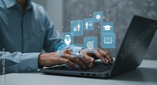Man using smartphone with customer feedback icons rating stars and positive emotion symbols for online business reputation management