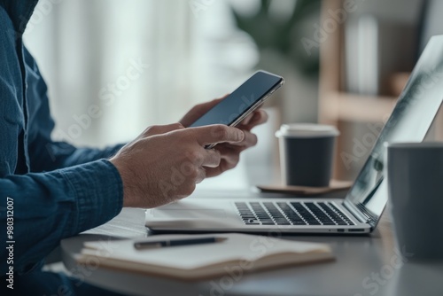Man Using Smartphone with Laptop and Notebook Nearby