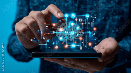 Man using tablet with AI digital brain interface and smartphone for business and network communication