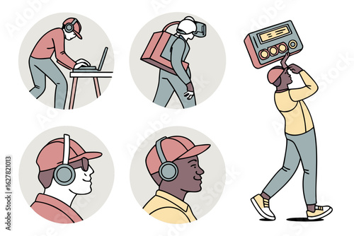Man using technology and listening to music, isolated on white background