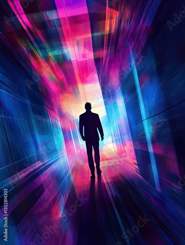 Man Walking Through a Colorful Abstract Tunnel Toward a Bright Light