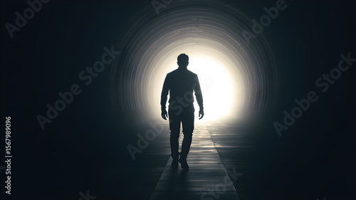 Man walks towards the light in dark empty space. Light at the end of the tunnel concept. Generative AI