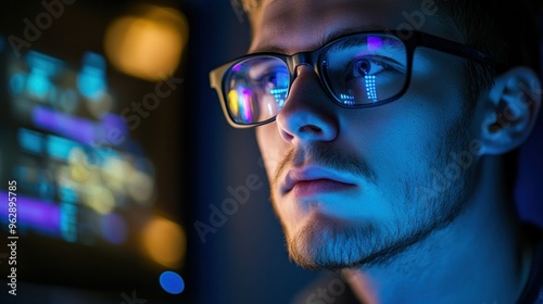 Man wearing glasses looking at computer screen Blue light from computer screens working with computer
