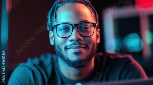 man Wearing Glasses, Using Laptop Computer, Looking at Camera and Smiling