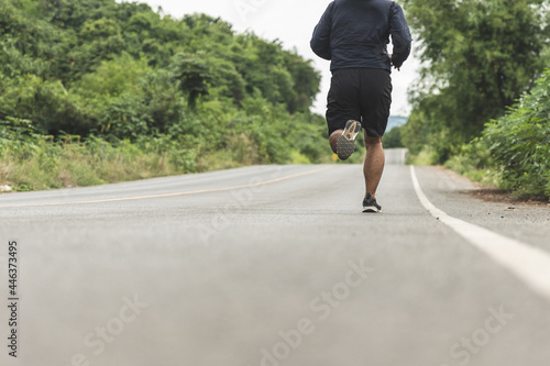 Man wearing sportswear running on the road with mountain background. Young man jogging for exercise in the nature. healthy lifestyle and sports concept.