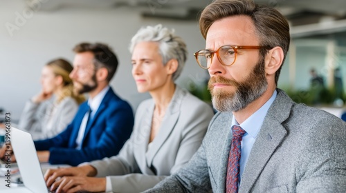 Man with a beard and glasses sits at a desk with a laptop. He is wearing a suit and tie. The other people in the room are also dressed in business attire