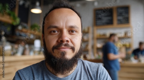 Man with a beard seated in a cafe, enjoying a relaxed atmosphere with friends and baristas in the background during a sunny afternoon