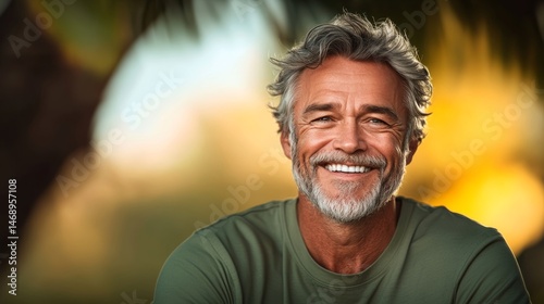 Man with a big smile on his face is wearing a green shirt. He is posing for a picture and he is happy