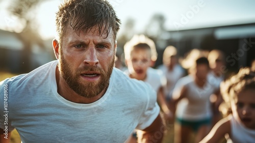 Man with a rugged beard intensely runs ahead of children outside, leading an energizing group fitness session on a sunny day in an open field setting.