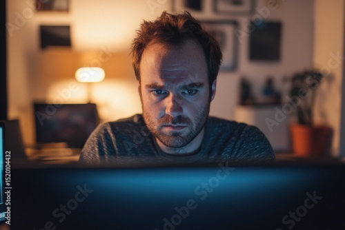 Man with a serious expression intensely focused on a computer screen in a dimly lit home office, illuminated by the glow of the monitor