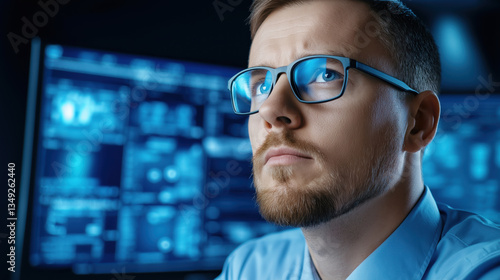 Man with beard wearing blue glasses and shirt with computer screen reflection in dark office environment. Technology professional concept for cybersecurity services and IT recruitment campaigns