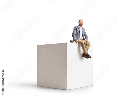 Man with books sitting on a white cube