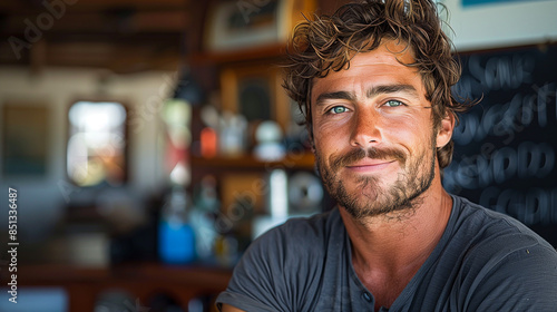 Man with brown hair, beard, and gray t-shirt smiles in rustic interior with wooden shelf & blackboard. Background suggests beachside bar or cafe