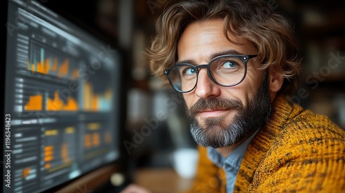 Man with glasses looking thoughtfully at computer screen displaying data graphs.