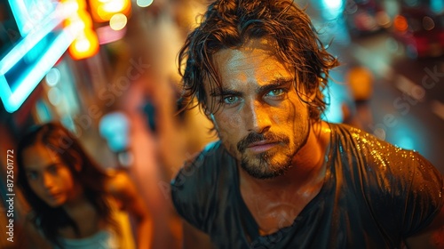 Man with Intense Look in Neon-lit Urban Setting - Generative AI