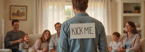Man with "Kick Me" sign smiling in playful family gathering