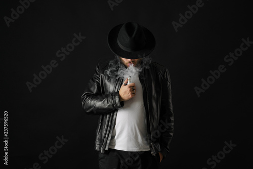 Man with vaping mod exhaling steam at black studio background. Bearded guy smoking e-cigarette to quit tobacco. Vapor and alternative nicotine free smoking concept