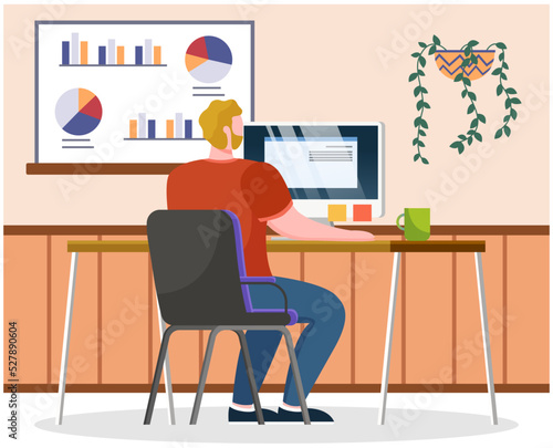 Man working at office with computer at workplace. Employee manager or businessman sitting at desk, looking at laptop, writing notes, doing tasks. Effective time management, workspace, workflow