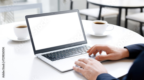 Man working in coffee shop on laptop with empty screen mockup.