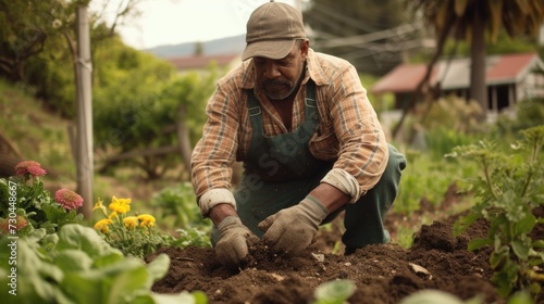 man working in soil in garden, in the style of light brown and green, nature-inspired
