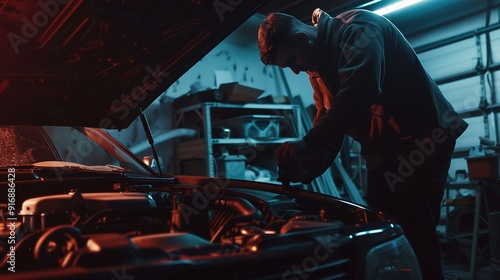 Man working on car in garage at night